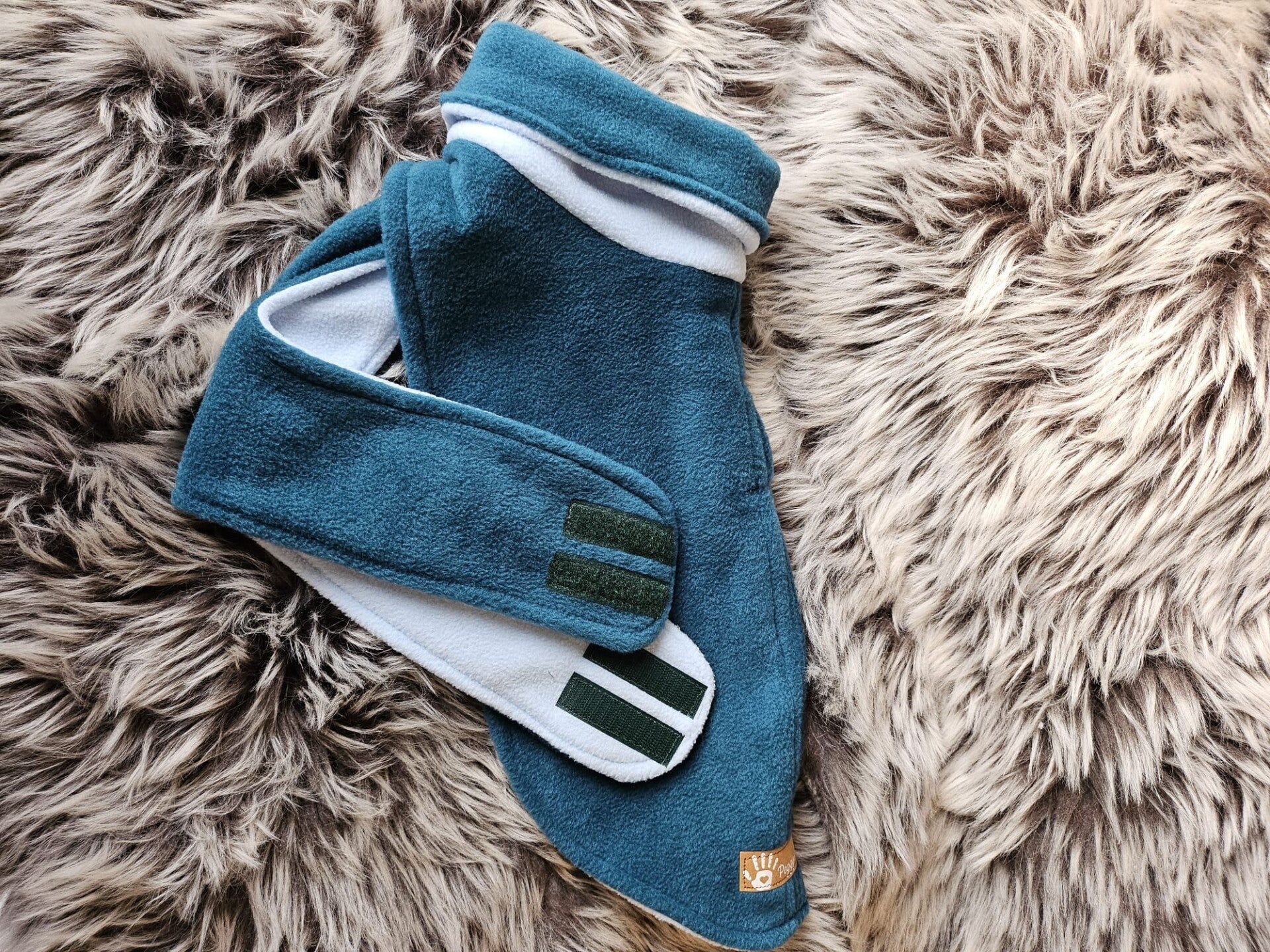 Erhältlich in verschiedenen Farben, kann der Mantel individuell gestaltet werden, z. B. mit einer praktischen Öffnung für das Anleinen am Geschirr, mit Druckknöpfen oder Klettverschluss. Der Schnitt wird speziell an die Maße Ihres Hundes angepasst, egal ob groß oder klein, schlank oder kräftig. Der Fleecemantel ist robust, maschinenwaschbar und pflegeleicht – ein praktisches und stilvolles Accessoire für Ihren Vierbeiner.
